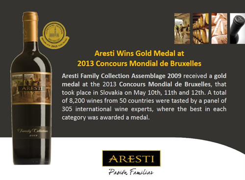 5月17日,第20屆布魯塞爾國際葡萄酒大賽(Concours Mondial de Bruxelles)公布結(jié)果,來自智利阿雷斯帝酒莊的2009年份家族珍藏干紅葡萄酒(ARESTI Family Collection)獲得本次大賽的金獎。