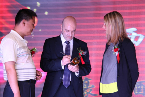 豪龍酒莊莊主卡梅隆先生為嘉賓簽名留念,并與大家一起表演了節(jié)目,現(xiàn)場(chǎng)氣氛熱烈而活躍。(文/楊秀紅)